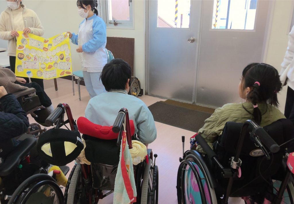さらに、毎日おいしい給食を作ってくださる給食調理員さんへ、児童生徒が感謝の気持ちを込めてメッセージを書きました。小学部2年生のみなさんから、調理員さんに手作りのメッセージを手渡しました。